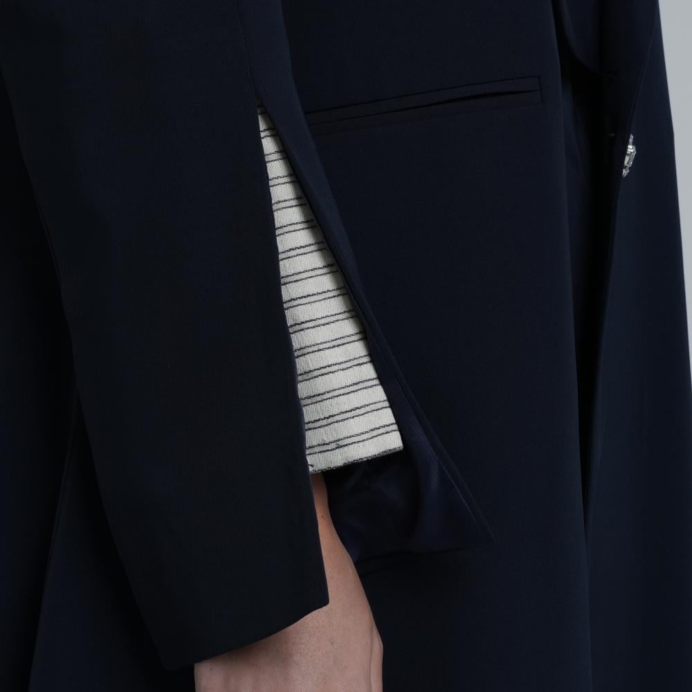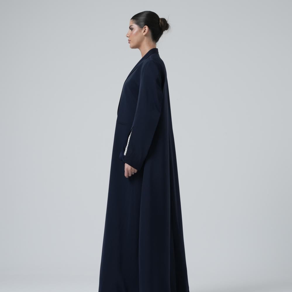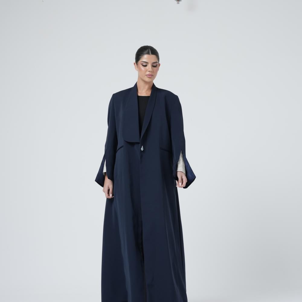 تألقي بعباية كحلي فاخرة بتفاصيل أنيقة في الأكمام المفتوحة وبطانة مخططة تضيف لمسة عصرية بتصميم أنثوي مميز يمنحك مزيج من الخصوصية والجاذبية